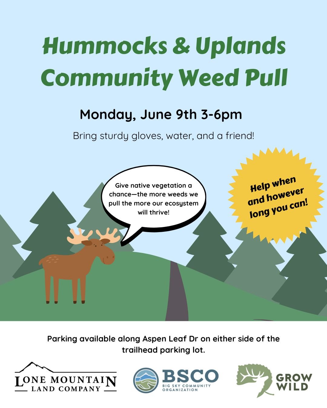Join Grow Wild, Big Sky Community Organization, and Lone Mountain Land Company for an afternoon of pulling weeds! Come any time between 3-6pm and stay as long or as short as you wish. Any help is appreciated!